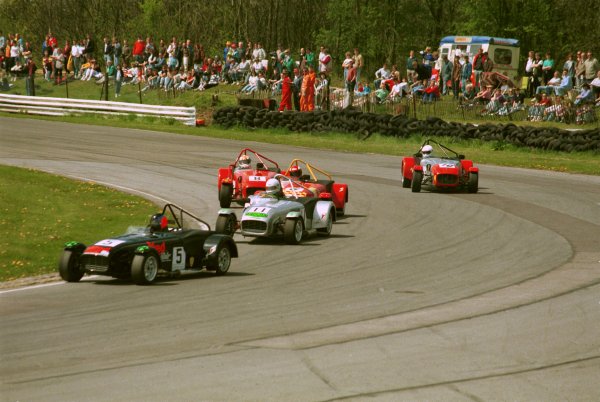 Magnus Laird leads a bunch of Caterhams at Quarry, Castle Combe